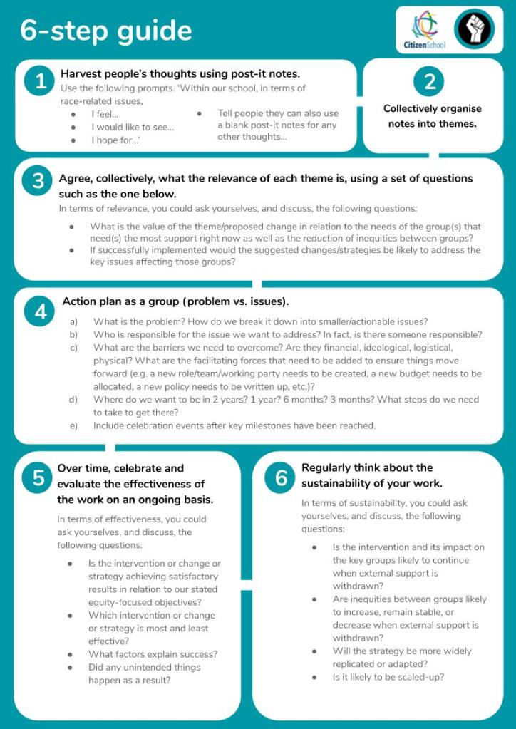 #BlackLivesMatter protocol for school communities to become anti-racist institutions. Download at http://www.citizenschool.org.uk/BLM-protocol